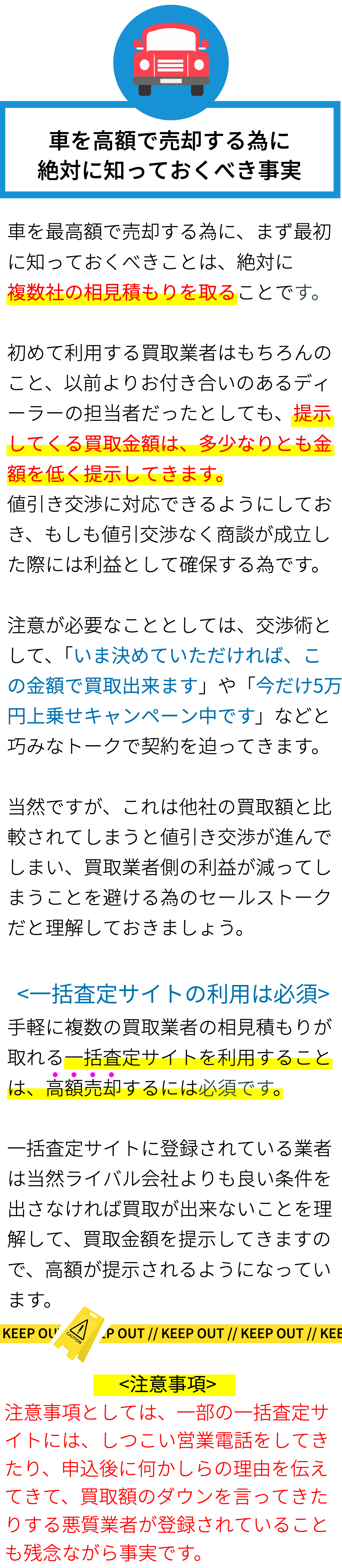 車買取一括査定は、複数の業者から査定を受けられる便利なサービスです。高額買取を狙えること、時間と手間を大幅に省けることが魅力です。しかし、注意点をしっかり把握し、適切に対応することが重要です。正確な情報提供や業者との交渉を通じて、自分にとって最適な条件で車を売却しましょう。